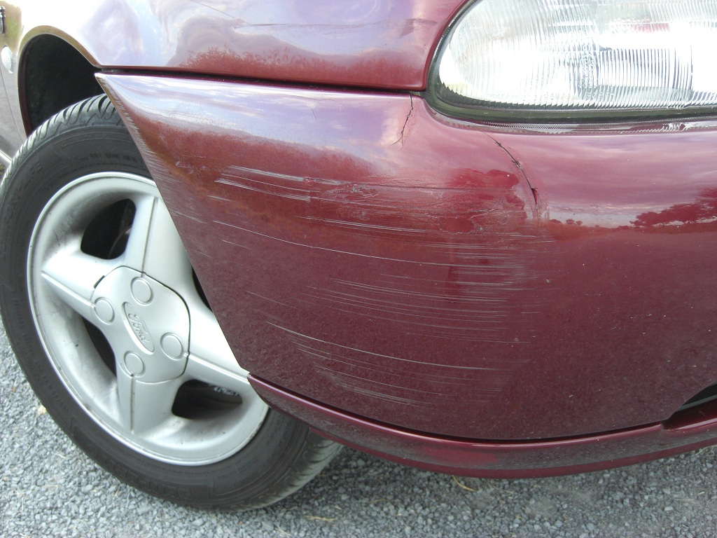 Stoßstange mit Riss und Streifschaden. Ist mit dem Riss durch den letzten TÜV gekommen. Oben am Kotflügel die "große" Delle.