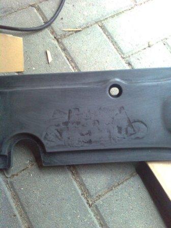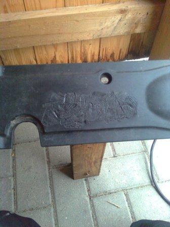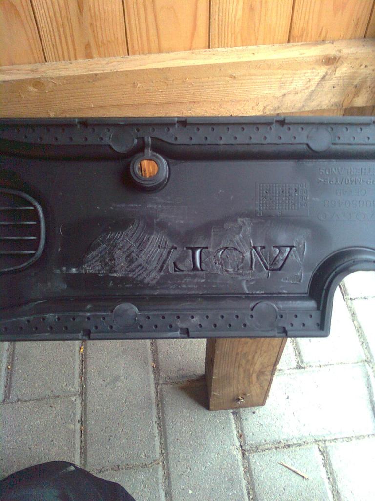 "Volvo" Buchstaben mit Heißluftpistole erhitzt und mit zwei Holzstücken zurück gedrückt