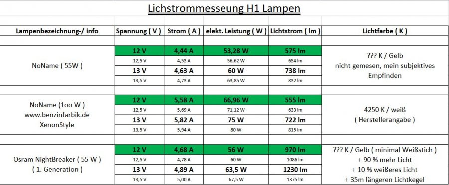 Also ich hoffe mal ich verstehe dich richtig und antworte demnach auch so Die Lampenspannung, habe ich mit nem Stinknormalen Mutlimeter gemessen, direkt an der Lampe im Auto..... Hier nochmal: Nur Zündung: 12V Motor an: 14V Die Helligkeitsmessung ( Lichtstrommessung ) habe ich in einer Ulbrecht Kugel ( 3m ) , mit "PowerMeter" und "Luxmeter" gemacht. Da wir hier bei mir auf der Schaff nen ganzen Lichtlabor haben mit so nem Zeug war das kein Problem.... Bei der Farbe dürfte das nicht wirklich die Rolle spielen, richtig.... Die werden die selbe Farbtemperatur haben wie die selbe Modellreihe in H1 oder H7....